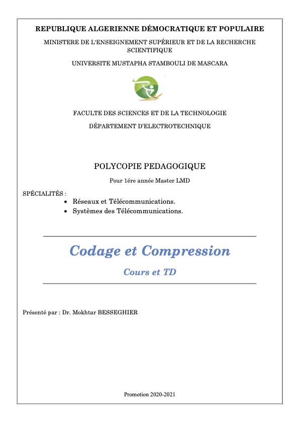 Ce cours intitulé Codage et Compression, destiné aux étudiants en Master Réseaux et Télécommunications, présente les fondements théoriques et pratiques de la compression des données et du codage de source et de canal. Il couvre les techniques de codage entropique (Huffman, Shannon-Fano, arithmétique, LZW), les méthodes de compression avec et sans perte (DCT, DWT, quantification), ainsi que les principes du codage canal (codes en blocs, convolutifs, turbo-codes). Le cours inclut également une étude détaillée des normes de compression d’images (JPEG, JPEG2000) et propose des travaux dirigés TDs pour appliquer les concepts abordés.