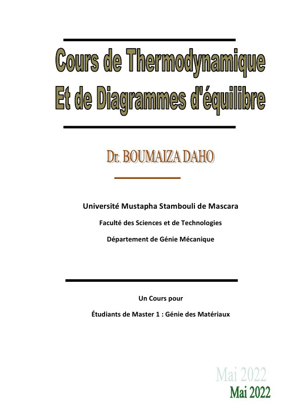 Durant l’élaboration de ce cours, nous avons travaillé à respecter le canevas des programmes pour l’étudiant en LMD du génie matériaux. Comportant trois chapitres principales, ce cours s’appuie sur des notions de base en thermodynamique, tels que la première et la deuxième loi de thermodynamique, qui constitue le cœur du premier chapitre, tandis que le deuxième aborde une exploitation des sujets théoriques et pratiques concernant la construction et la lecture d’un diagramme d’équilibre binaire. Et pour conclure, le chapitre 3, cherche à approfondir les notions acquises, en traitant le sujet des diagrammes d’équilibre à trois composants, dites ternaires.