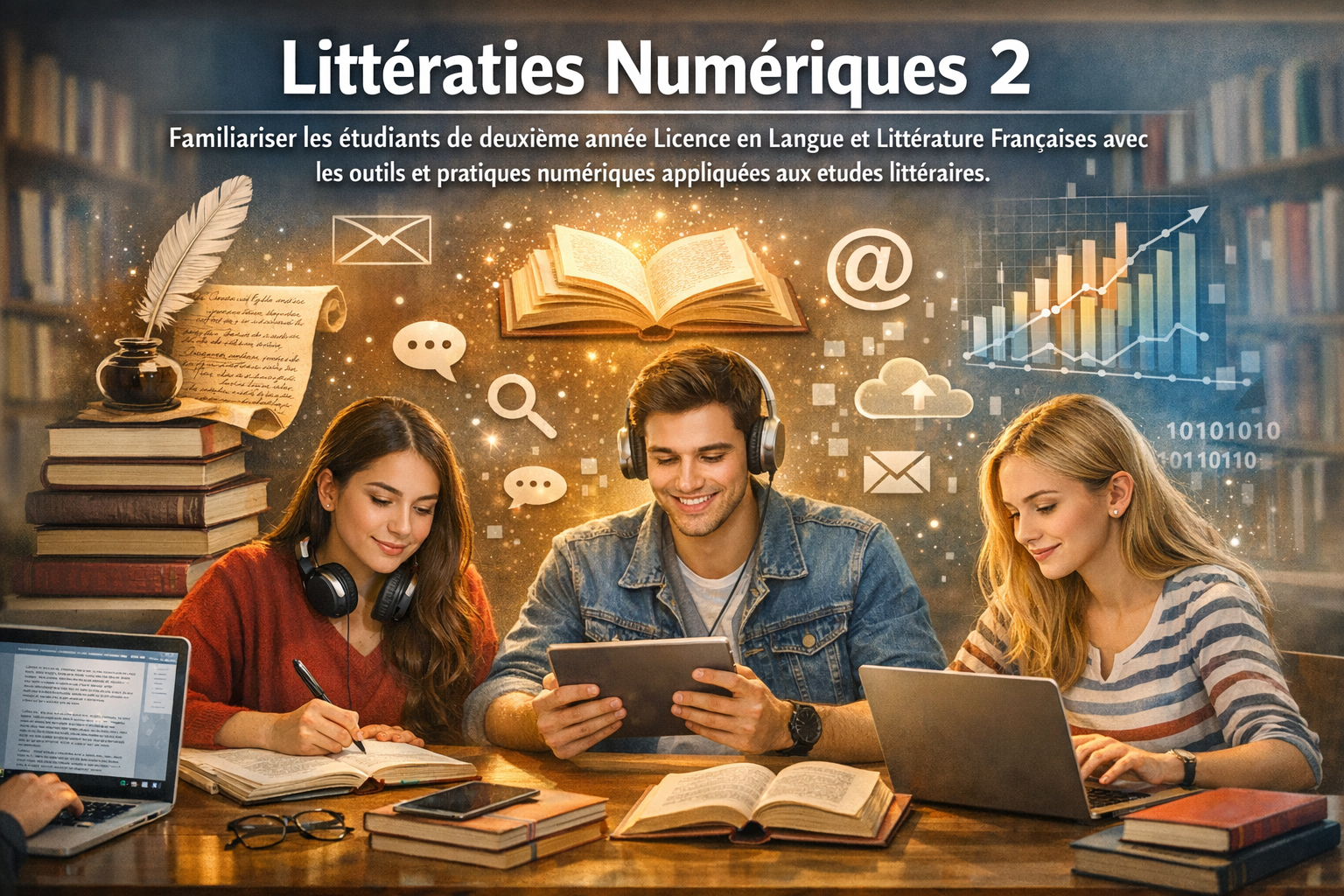 Le module Littératies Numériques 2 a pour objectif de familiariser les étudiants de deuxième année Licence en Langue et Littérature Françaises avec les outils et pratiques numériques appliquées aux études littéraires.